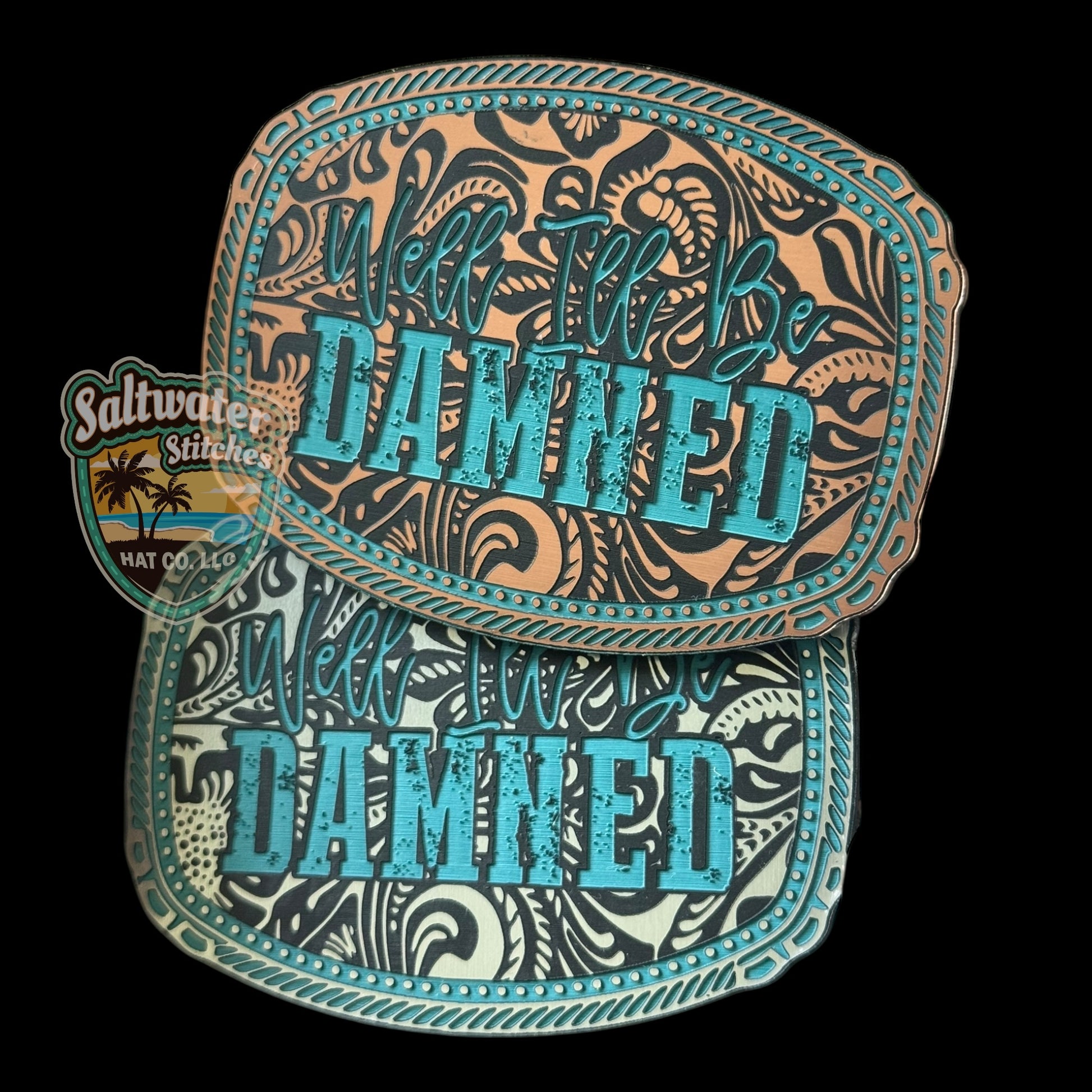 Well I'll Be Damned tri layer acrylic in copper/turquoise/black or stainless/turquoise/black.